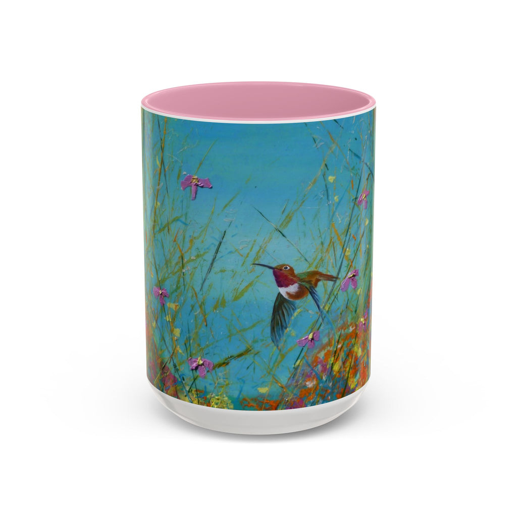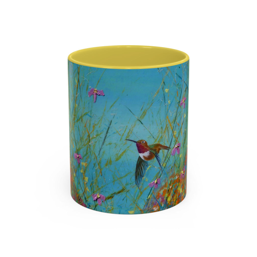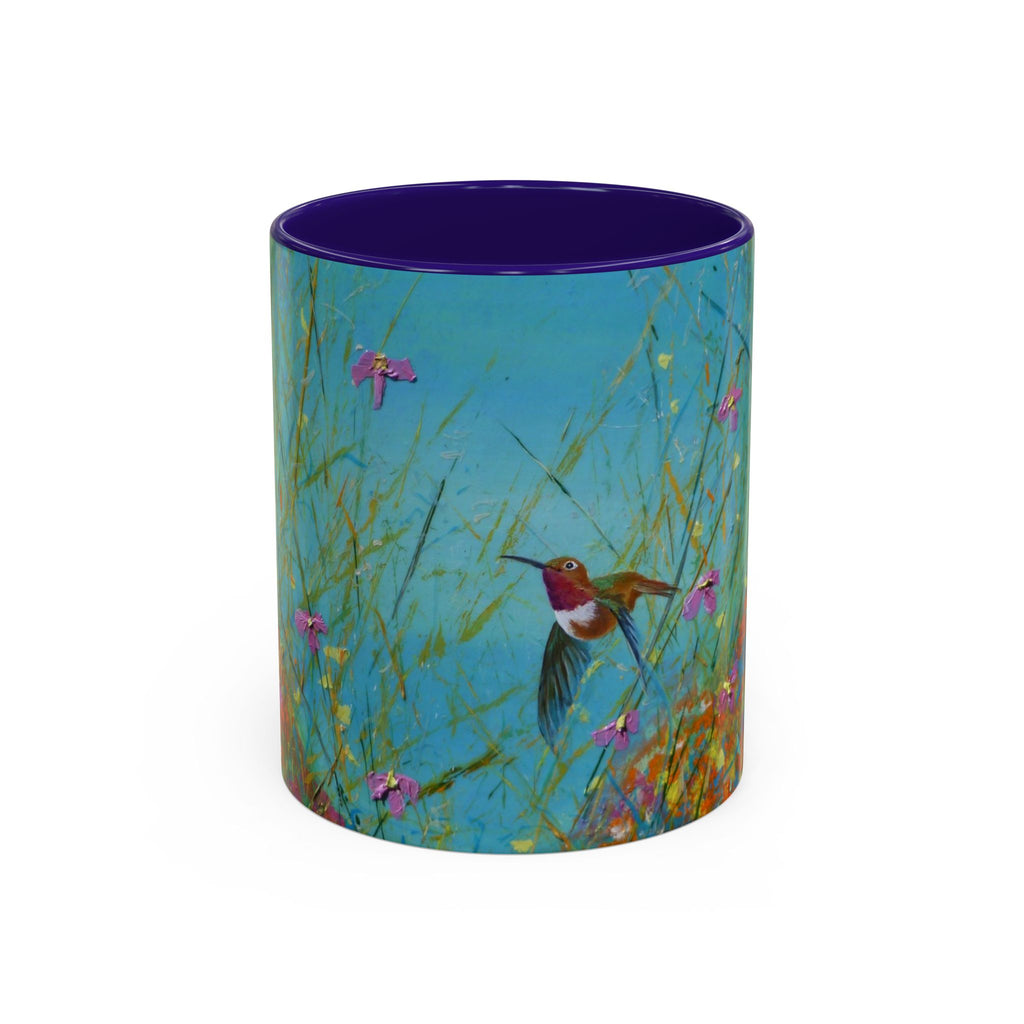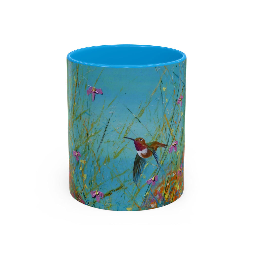 This vibrant Mug features an Allen Hummingbird flying home after a days work of harvesting in the meadow. Perfect for bird lovers and nature enthusiasts, it adds a touch of color and whimsy to your morning coffee or tea routine. Ideal for gifting on birthdays, holidays, and special occasions.