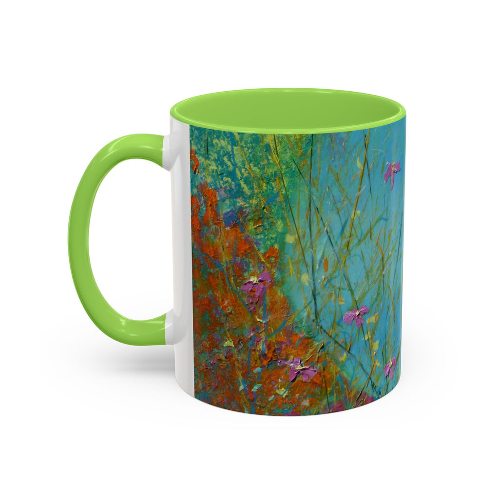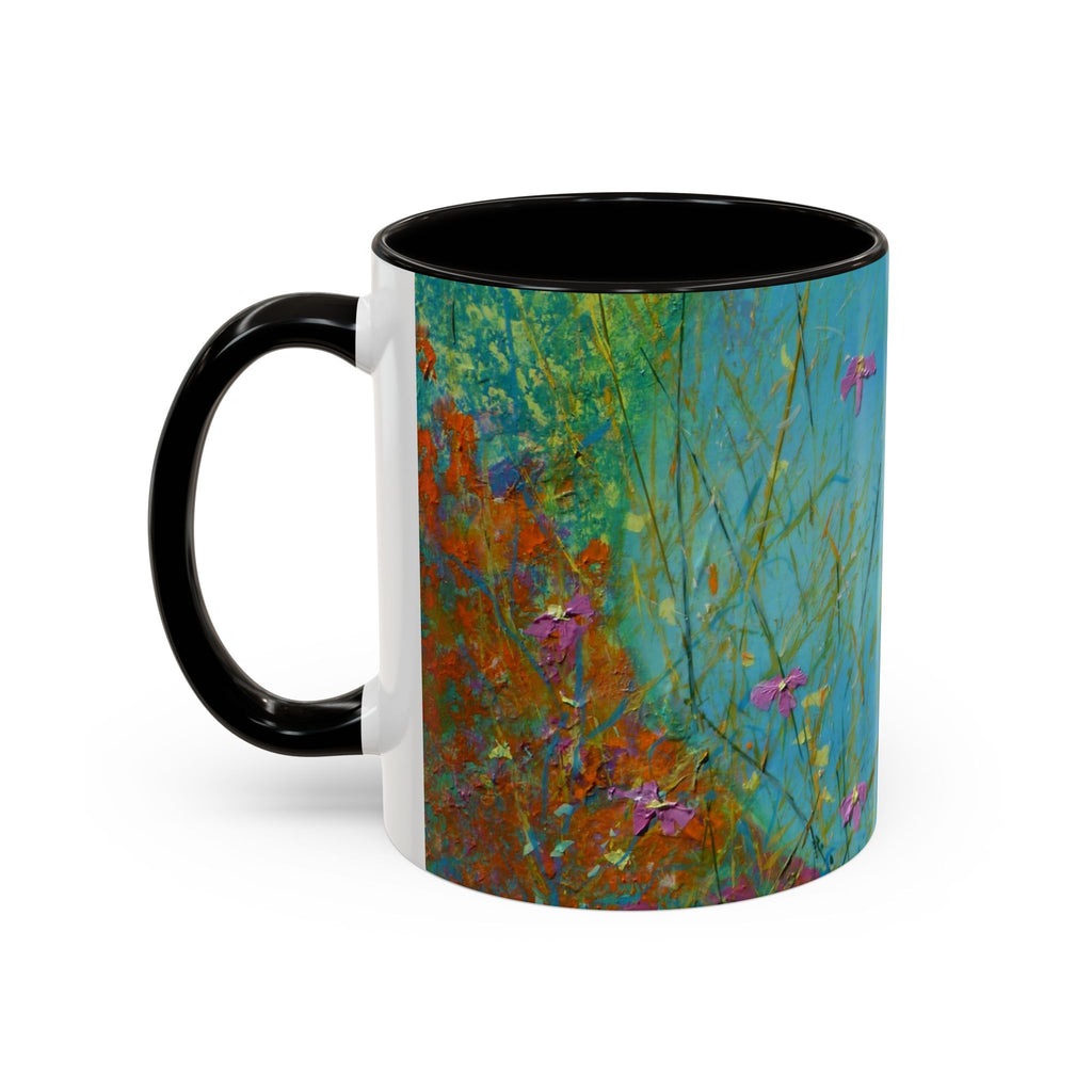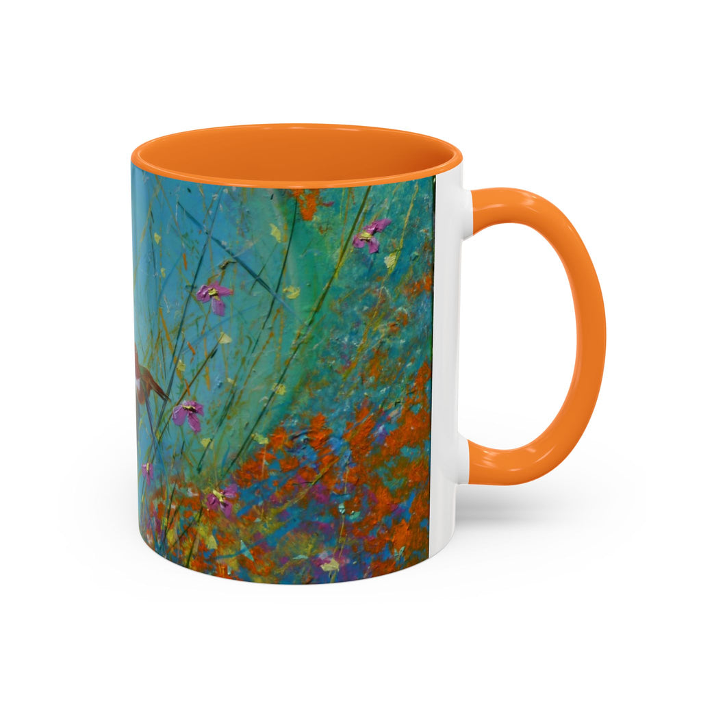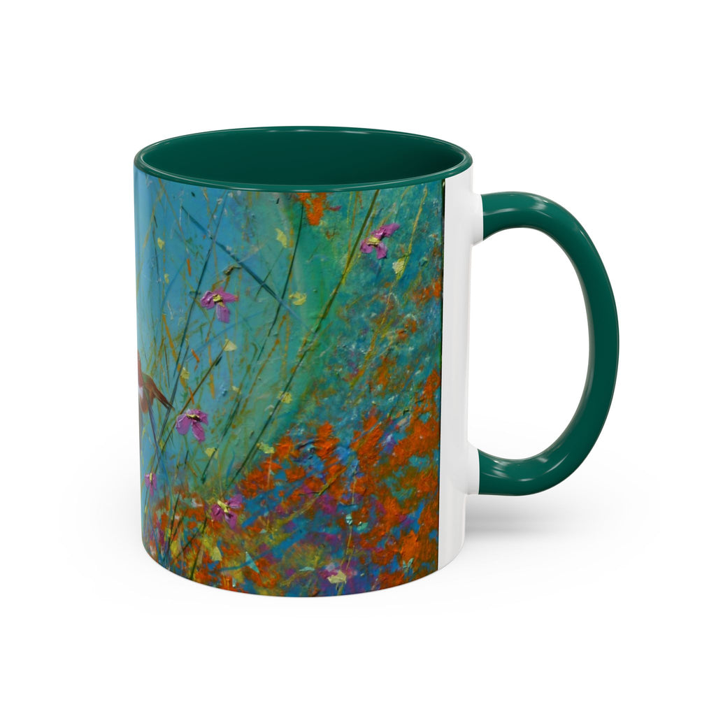 This vibrant Mug features an Allen Hummingbird flying home after a days work of harvesting in the meadow. Perfect for bird lovers and nature enthusiasts, it adds a touch of color and whimsy to your morning coffee or tea routine. Ideal for gifting on birthdays, holidays, and special occasions.