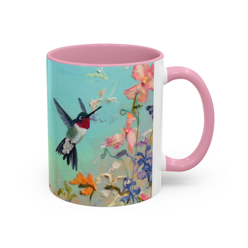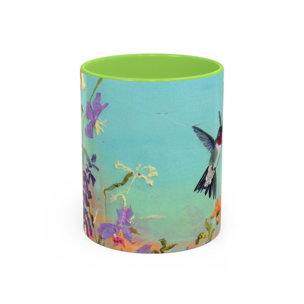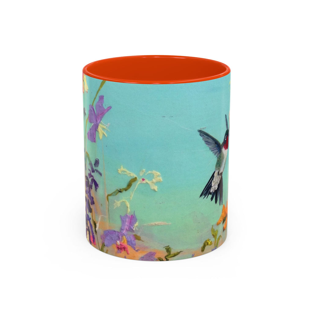 Bring the vibrant colors of a summer day into your mornings with this colorful mug featuring a hummingbird diving into a flower meadow. Perfect for nature lovers and those who appreciate a touch of whimsy in their daily routine. Ideal for gifting on birthdays, Mother's Day, or any special occasion.