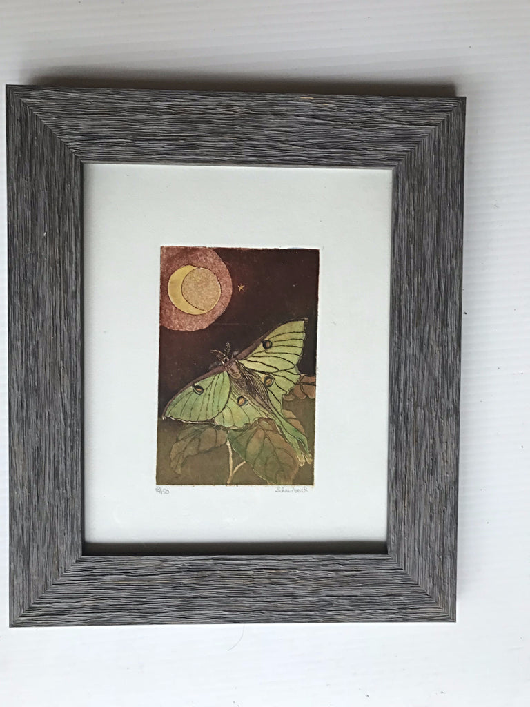 Luna Moth , One Plate Aquatint etching embelishedwith iridescent watercolor.